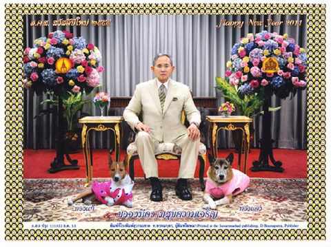 เมื่อวันที่ 31 ธ.ค. พระบาทสมเด็จพระเจ้าอยู่หัว พระราชทาน ส.ค.ส. ปีพุทธศักราช 2554 แก่ประชาชนชาวไทย ส.ค.ส.พระราชทานของพระบาทสมเด็จพระเจ้าอยู่หัวในปีพุทธศักราช 2554 นี้ เป็นพระบรมฉายาลักษณ์พระบาทสมเด็จพระเจ้าอยู่หัว ทรงฉลองพระองค์สากลสีครีมผ้าปักพระกระเป๋าเป็นผ้าลายริ้วสีเหลืองสลับเทา ฉลองพระองค์ชั้นในเป็นเชิ้ตขาว ทรงผูกเนกไทลายริ้วสีเหลืองสลับเทา ประทับบนพระเก้าอี้ ด้านข้างพระเก้าอี้ที่ประทับทั้งสองข้างมีโต๊ะสูง โต๊ะด้านซ้ายวางแจกันแก้วก้านสูงปักดอกไม้หลากสี โต๊ะด้านขวาวางแจกันแก้วขนาดเล็กปักดอกไม้หลากสีเช่นกัน ทรงฉายกับสุนัขทรงเลี้ยง 2 สุนัข คือ คุณทองแดงที่ทรงเลี้ยงมาตั้งแต่ปี 2541 หมอบอยู่หน้าพระเก้าอี้ด้านขวาและคุณทองแท้ที่ทรงเลี้ยงมาตั้งแต่ปี 2542 หมอบอยู่หน้าพระเก้าอี้ด้านซ้าย