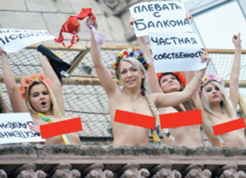 อากาศหนาวจัดในกรุงเคียฟร้อนขึ้นมาตะหงิดๆ เมื่อสาวกลุ่ม 'ฟีเมน' ในยูเครนถอดเสื้อขึ้นโชว์อกบนระเบียง
