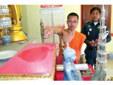 ลักพระ - พระวัดอรุณรังสี อ.เมือง จ.มุกดาหาร ชี้ให้ดูร่องรอยคนร้ายลักพระพุทธรูปสิงห์สอง ไปจากโบสถ์ภายในวัด ตร.เตรียมตามพระภิกษุที่หายตัวไปพร้อมกันมาสอบปาก คำแล้ว ตามข่าว