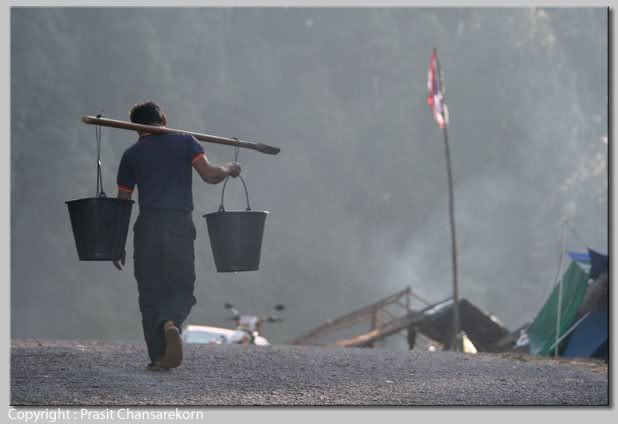 ชายจีนคนหนึ่งแบกถังน้ำสองใบไว้บนบ่าเพื่อไปตักน้ำที่ริมลำธาร