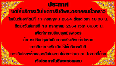ด้วยทางสนง. การันตีพระ จะหยุดปรับปรุง server ชั่วคราว ตามวันและเวลาตามประกาศข้างบนนี้ ผู้ตั้งประมูลแบบวัดใจ ต้องระวังไว้ด้วยนะครับ ส่วนผู้ร่วมประมูลก็ต้องคอยลุ้นหาจังหวะดีดี เพื่อของถูกครับ
