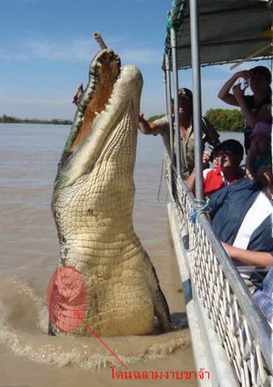 เมื่อวันที่ 12 กรกฎาคมที่ผ่านมา เว็บไซต์เดลิเมล ของอังกฤษ เปิด เผยภาพสุดอึ้ง จระเข้ขนาดมหึมาโดดงับชิ้นเนื้อจิ๋ว สร้างความตื่นตาตื่นใจให้กับนักท่องเที่ยวบนเรือล่องแม่น้ำในออสเตรเลียเป็นอย่างมาก โดยภาพดังกล่าวนี้ ถูกถ่ายจากบนเรือล่องแม่น้ำแอดิแลด เมืองดาร์วิน ขณะที่นักท่องเที่ยวกำลังเพลิดเพลิน