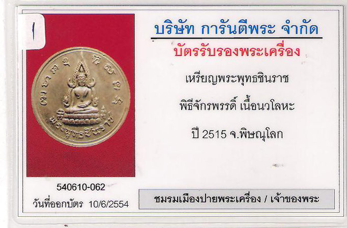 พระปิดประมูลวันที่ 25-7-2554 ส่งพระไปออกบัตร บ่ายวันที่ 25-7-2554 พระถึงสำนักงาน 27-7-2554