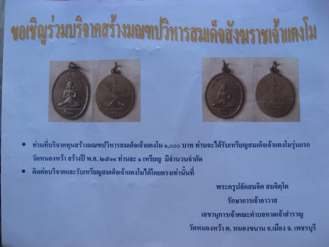 ...สำหรับท่านที่ทำบุญ 1,000 บาท จะได้รับเหรียญสมเด็จพระสังฆราชเจ้าแตงโมรุ่นแรก วัดหนองหว้า สร้างปี พ.ศ. 2511 ท่านละ 1 เหรียญ...มีอยู่ 14 เหรียญ...(ผมทำบุญใว้ 1 เหรียญครับ คงเหลือ 13 เหรียญครับ)...
