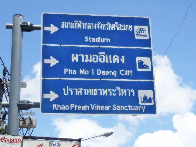 วันที่ 5 ก.ย. ผู้สื่อข่าวรายงานจากจ.ศรีสะเกษ ว่า ขณะนี้ตามถนนทุกสายที่เข้าสู่ตัวเมืองศรีสะเกษ และเส้นทางที่ไปสู่ อ.กันทรลักษ์ จ.ศรีสะเกษ ป้ายบอกเส้นทางท่องเที่ยวทุกป้ายที่จะไปสู่ปราสาทพระวิหาร ที่อยู่กับแนวชายแดนไทยกัมพูชา ด้านอ.กันทรลักษ์ ในพื้นที่ความรับผิดชอบของ แขวงการทางจังหวัดศรีสะเกษ สังกัดสำนักทางหลวงที่ 7 (อุบลราชธานี) ถูกเปลี่ยนชื่อภาษาอังกฤษใหม่ จากเดิมเคยใช้ทับศัพท์ภาษาไทยว่า Khoa Phrawihan ถูกเปลี่ยนเป็น Khao Preah Vihear ตามอย่างที่กัมพูชาใช้มาตลอด โดยถูกนำขึ้นไปติดตั้งใหม่กว่า 30 จุดตลอดเส้นทางที่มุ่งไปสู่ อุทยานแห่งชาติเขาพระวิหาร
