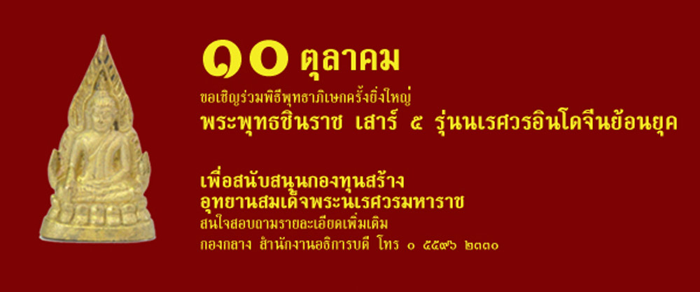 มหาวิทยาลัยนเรศวร ร่วมกับ วัดพระศรีรัตนมหาธาตุวรมหาวิหาร เตรียมจัดพิธีพุทธาภิเษกพระพุทธชินราชเสาร์ 5 รุ่นนเรศวรอินโดจีนย้อนยุค โดยมีวัตถุประสงค์ในการจัดสร้างวัตถุมงคล เพื่อสนับสนุนการสร้าง "อุทยานสมเด็จพระนเรศวรมหาราช" สถานที่ยึดเหนี่ยว เป็นที่สักการะ และเป็นแหล่งรวบรวมสรรพสิ่งของบูรณกษัตริย์ในสมัยพิษณุโลก และทุกๆสมัย ให้เป็นแหล่งเรียนรู้กับคนไทยทั้งประเทศ ให้รู้สึกถึงความเสียสละ ไม่เห็นแก่ประโยชน์ส่วนตัว อุทิศตนให้แก่ส่วนรวม รวมถึงเป็นแหล่งแลกเปลี่ยนเรียนรู้ศิลปวัฒนธรรมของประเทศลุ่มน้ำอินโดจีน โดยกำหนดจัดพิธีพุทธาภิเษกในวันจันทร์ที่ 10 ตุลาคม พ.ศ.2554 ระหว่างเวลา 13.00 น. – 17.09 น. ณ ลานพระบรมราชานุสาวรีย์สมเด็จพระนเรศวรมหาราช มหาวิทยาลัยนเรศวร จังหวัดพิษณุโลก
