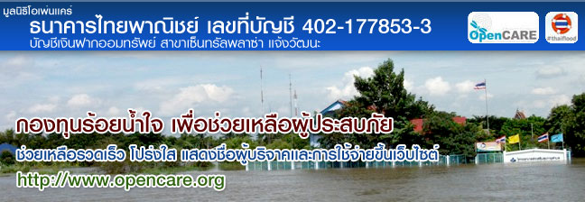 มูลนิธีโอเพ่นแคร์ (www.opencare.org): บัญชี กองทุนร้อยนํ้าใจ เพื่อช่วยเหลือผู้ประสบอุทกภัยตลอดลำนํ้ายมมูลนิธีโอเพ่นแคร์ ธ.ไทยพาณิชย์ 402-177853-3 http://on.fb.me/oLnwNj