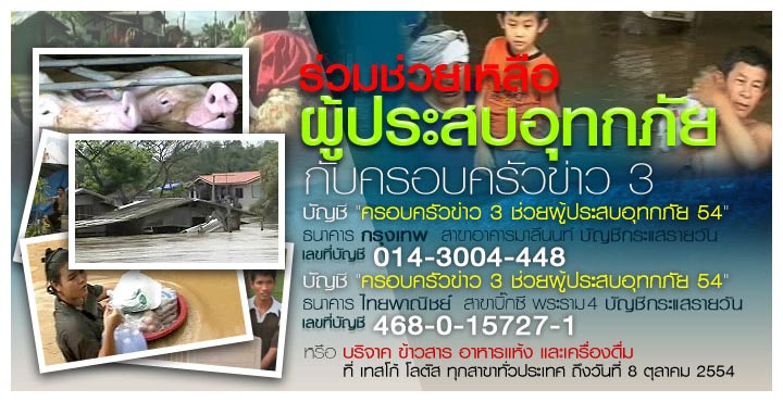 ครอบครัวข่าว 3: บัญชี “ครอบครัวข่าว 3 ช่วยผู้ประสบอุทุกภัย 54″ กระแสรายวัน ธ.กรุงเทพ สาขามาลีนนท์ เลขที่ 014-3-00444-8