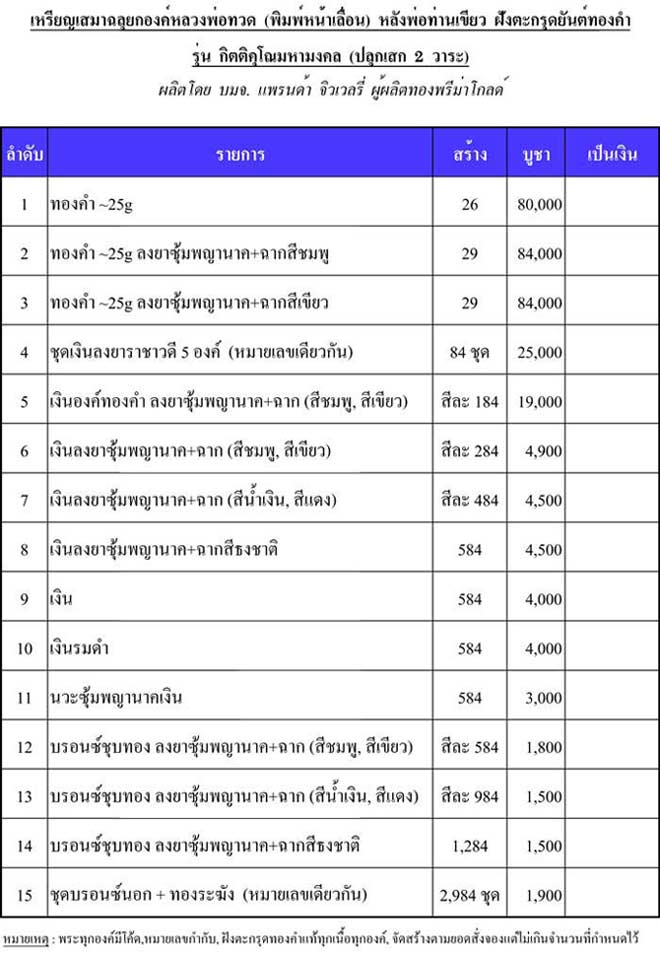 ทุกเหรียญ ตั้งแต่ เหรียญทองคำ ไล่ลงไปถึงเหรียญ บรอนซ์นอก และ ทองระฆัง ด้านหลังเหรียญ จะฝังแผ่นตระกรุด ทองคำแท้ ซึ่งจะปลุกเสกโดย หลวงปู่ เขียว ทุกเหรียญ งานนี้ เรียกว่า คุ้มและ สุดยอดกันเลยนะครับ