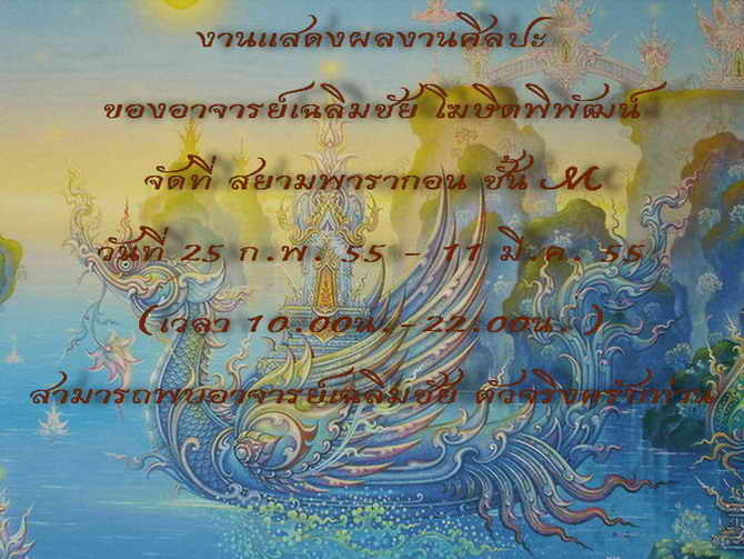 งาน จัดแสดงผลงานศิลปะของอาจารย์เฉลิมชัย โฆษิตพิพัฒน์ อาทิรูปวาดร่วม 50 ชิ้น, องค์พระพุทธประทานยศบารมี , ที่สำคัญอาจจะได้ชมองค์ต้นแบบ พระพิฆเนศ ซึ่งเป็นผลงานชิ้นล่าสุด ที่สุดๆจริงๆครับ