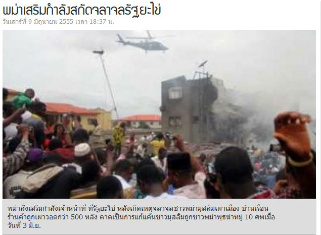 วันนี้ (9 มิ.ย.) สำนักข่าวต่างประเทศรายงานว่า ทางการพม่าได้ส่งกองกำลังเสริมทั้งทหารและตำรวจ ไปยังรัฐยะไข่ ทางตะวันตกของประเทศ หลังเกิดเหตุชาวพม่ามุสลิมก่อการจลาจลในเมืองหม่องดอว์ และเมืองบูธิด่อง ตั้งแต่เมื่อวานนี้ โดยเจ้าหน้าที่ท้องถิ่นรายหนึ่ง เปิดเผยว่า กลุ่มผู้ก่อจลาจลราว 1,000 คน ได้ทุบทำลายและเผาบ้านเรือนประชาชนไปแล้ว 494 หลัง ร้านค้า 19 ร้าน และชาวพม่าพุทธถูกสังหารเมื่อวันศุกร์อย่างน้อย 7 ศพ บาดเจ็บอีก 17 ราย