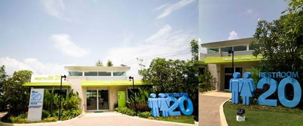 ในแวบแรกที่เห็น ขอสารภาพว่าไม่นึกว่านี่คือห้องน้ำในปั๊มน้ำมัน เพราะว่ามันดูสะอาดสะอ้านมากๆ แต่เมื่อเราเหลือบไปเห็นสัญลักษณ์ห้องน้ำชาย-หญิง ขนาดเท่าคนจริง พร้อมคำว่า Restroom 20 สีฟ้าสดใส ตั้งโดดเด่นสะดุดตาอยู่ด้านหน้าอาคาร ก็ค่อยแน่ใจได้ว่านี่คือห้องน้ำไม่ผิดแน่ล่ะ |