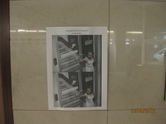 - เหตุเกิดที่อพาร์ทเม้นต์ที่ผมพักอาศัย อยู่ในเขตศรีราชา ห่างตึกคอมไม่ถึงครึ่งกิโล คืนวันที่ 10 /09/12 ที่ผ่านมา เธอได้งัดประตูสำนักงานของอพาร์ทเมนต์ เพื่อขโมยทรัพยสินและของมีค่า ได้โน๊ตบุครวมกระเป๋าสตางค์ รวมทั้งหีบห่อ ซอง ภัสดุไปรษณีย์(เก็บไว้ในสำนักงาน) ของผู้พักอาศัยในอพาร์ทเมนต์ไปด้วย