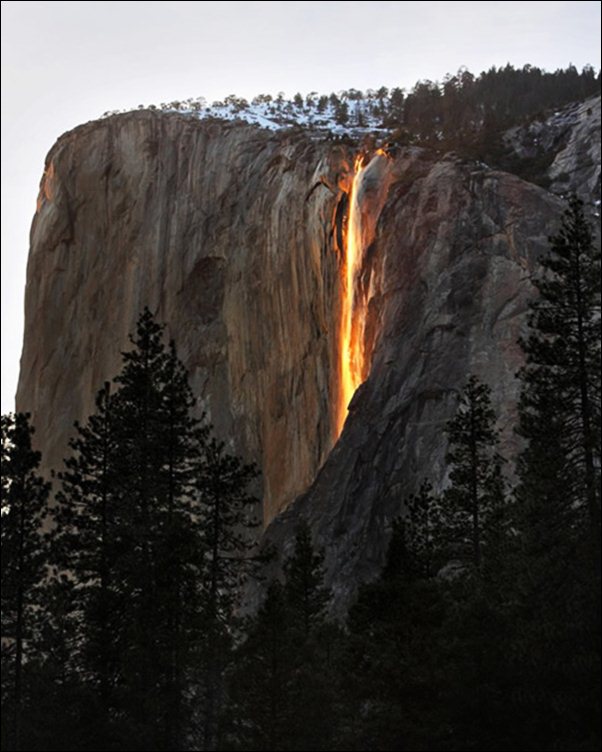 น้ำตกเพลิง เรียกอีกชื่อหนึ่งว่า Horsetail Fall น้ำตกหางม้า เป็นน้ำตก ที่สวย ที่สุด ในทวีปอเมริกาเหนือ และ เป็นความงดงาม อันแสนจะหาดู ได้ยาก เพราะจะปรากฏ ให้เห็นเพียง ปีละครั้ง ประมาณ 2 สัปดาห์ กลางเดือน กุมภาพันธ์ ของทุกปี ซึ่งเป็นช่วงที่ แสงอาทิตย์ตกกระทบ สาดส่อง น้ำตก พอเหมาะพอดี เกิดเป็นสายลาวา ลู่ลง เบื้อล่าง เหมือนหางม้า อันงามสง่า นั่นคือที่มาของ น้ำตกเพลิง อันสุดอลังการของธรรมชาติ ...............!!!!!