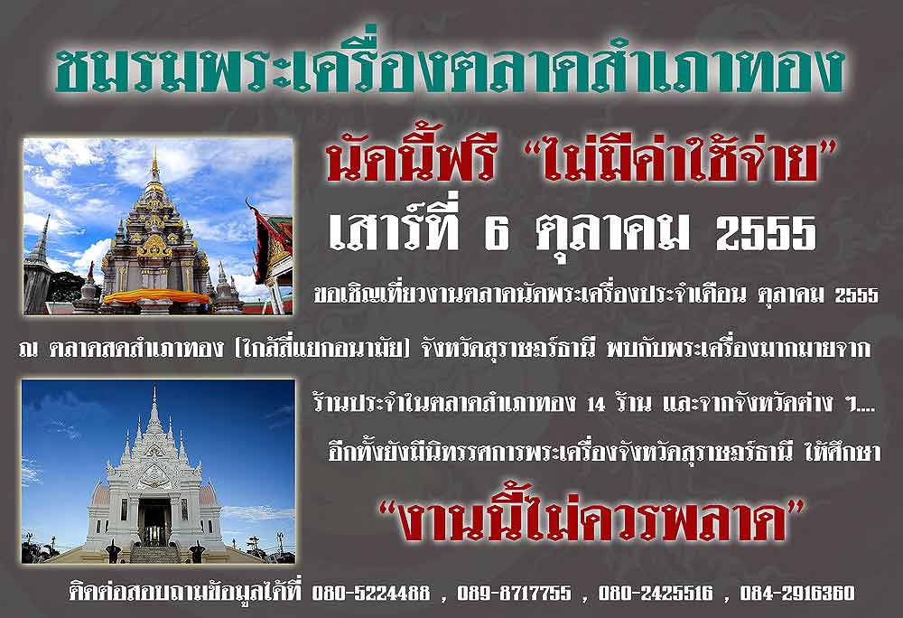เชิญเที่ยวงาน ตลาดนัดพระเครื่องประจำเดือนตุลาคม วันเสาร์ที่ 6 ตุลาคม 2555 ตั้งแต่เวลา 09.00น. ณ ตลาดสำเภาทอง จังหวัดสุราษฎร์ธานี...พบกับร้านพระเครื่องประจำ และแผงพระ จากจังหวัดต่าง ๆ...พร้อมชมนิทรรศการพระเครื่องจังหวัดสุราษฎร์ธานี ขนาดย่อม...เพราะฉะนั้นงานนี้ไม่ควรพลาดครับ...ทั้งผู้เช่า และแผงพระต่าง ๆ ไม่มีค่าใช้จ่าย...จึงประชาสัมพันธ์ให้ทราบกันครับ