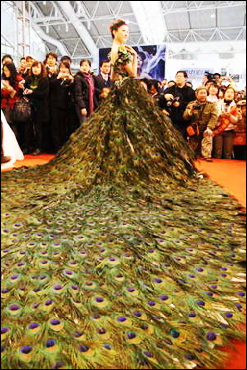 นางแบบในชุด เจ้าสาว ประดับขน นกยูง มูลค่า 1.5 ล้าน เหรียญสหรัฐ หรือ ประมาณ 52.5 ล้านบาท ยืนโพสต์ท่าให้ สื่อมวลชน ถ่ายภาพ ภายในงาน .. Wedding Expo .. ที่เมือง หนานจิง ประเทศจีน เมื่อช่วง วันหยุด สุดสัปดาห์ ที่ผ่านมา ชุด แต่งงาน ดังที่ เห็นในภาพ ถูกประดับ ประดา ด้วยขน นกยูง จำนวน 2,009 อัน ผ่านการเย็บ โดยช่าง ฝีมือดี 8 คน และใช้เวลา ในการ ประดิษฐ์ ประดอย ทั้งสิ้นกว่า 2 เดือน เลยนะครับ .............!