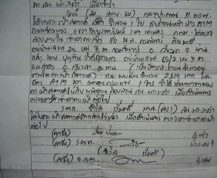 พอวางสายไป ก็เอาไงดีหว่า เดินไปเจอตำรวจจราจร ก็เข้าไปถามว่าอยู่ท้องที่ สน.ไหน สุดท้ายก็เลยไปแจ้งความและฝากกระเป๋าไว้ที่ตำรวจ สน.พระราชวัง แต่บอกเลยว่าเดินไกลโคตร ๆ แถมร้อนอีกตะหาก สน.นี้ดีครับ ตำรวจพูดจาดีให้การต้อนรับดี ยิ้มแย้มแจ่มใจ บอกจะรีบดำเนินการให้ เสร็จเรื่องเดินออกมาจาก สน.ทนร้อนไม่ไหว เลยเรียกแท็กซี่กลับบ้าน เสียเงินไปอีกร้อยกว่าบาท ธุระที่จะไปทำก็พักไว้ก่อน เฮ้อ ,, ทำความดีมันยากและร้อนอย่างนี้นี่เอง