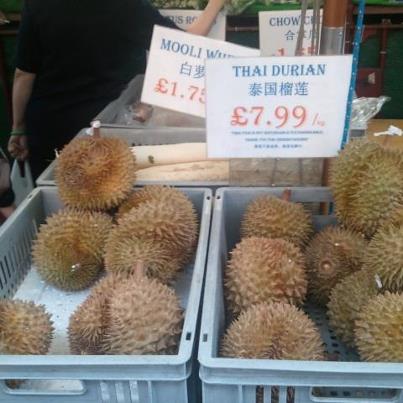 ทุเรียนที่ขายในถิ่นคนจีน (China Town) กรุงลอนดอน กิโลกรัมละ 7.99 ปอนด์ (ประมาณ 400 บาท) ลองคิดดูว่าหากชาวสวนทุเรียนสามารถผลิตและส่งไปขายได้ทั่วโลกด้วยตนเอง หรือผ่านพ่อค้าคนกลางที่ให้ราคาอย่างยุติธรรม ทุเรียนกิโลกรัมละไม่กี่สิบบาทที่ไทย จะทำเงินได้มากกว่า 10 เท่า ชาวสวนทุเรียนไทยคงมีความสุขมาก |
