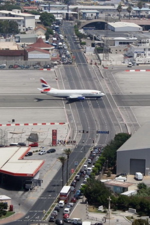 รูปภาพสนามบินใน Gibraltar เขตปกครองพิเศษ ของอังกฤษ เมืองเล็กๆทางตอนใต้ของสเปน เเต่ความน่าเเปลกเเละน่าสนใจอยู่ที่ รันเวย์ของสนามบินของ Gibraltar นั้นมันมีถนนตัดผ่านด้วยหนะสิ เเละที่เเปลกประหลาดยิ่งกว่า ก็คือจุดถนนกับรันเวย์นั้น จะใช้สัญญาณไฟจราจรในการให้ทาง อย่างเช่นในรูปภาพจะเห็นว่า รถติดไฟเเดง เพื่อรอให้เครื่องบิน บินขึ้นเสร็จเสียก่อน เเบบนี้ก็มีด้วยนะ ลองไปชมกันเลยครับ สนามบินใน Gibraltar เเปลกเเต่จริง |