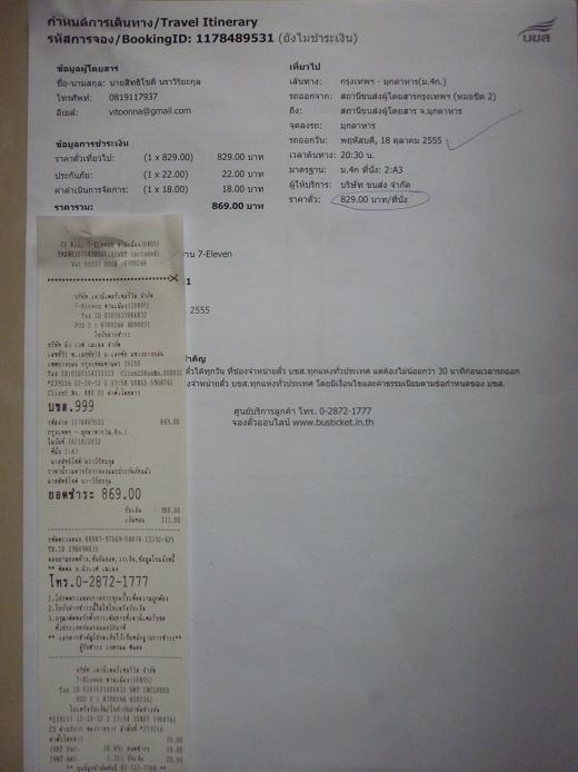 เดินทางจากรุงเทพมหานคร เวลา 20.30 น. ไปมุกดาหาร ถึงเวลา 06.30 ใช้เวลาเดินทาง 10 ชั่วโมง
