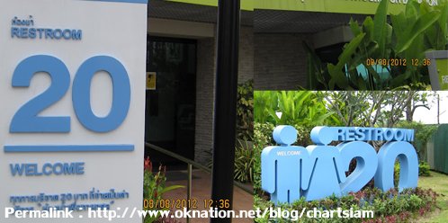 เดินเข้าไปภายในห้องน้ำ จะเห็นว่า สะอ้านมากครับ สัญลักษณ์ของห้องน้ำ ชายและหญิง ขนาดเท่าคนจริง ป้ายคำว่า RESTROOM 20 มีสีฟ้า สดใสสะดุดตา ตั้งอยู่หน้าห้องน้ำ