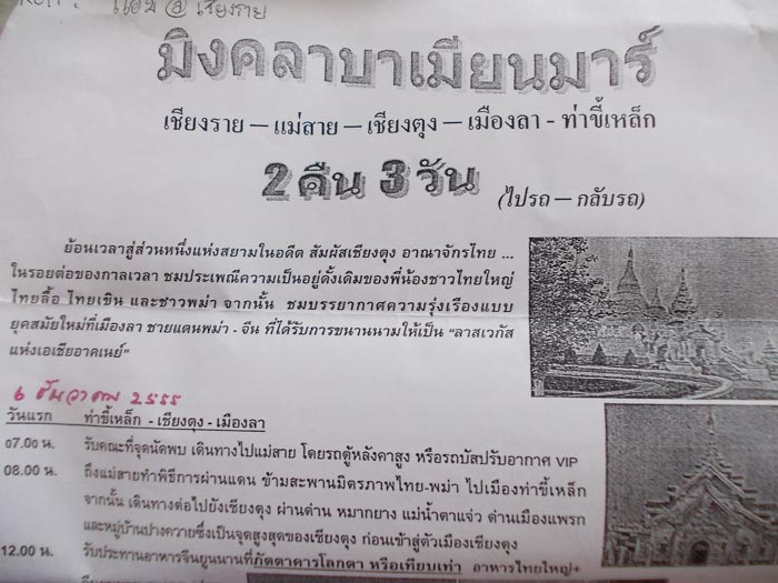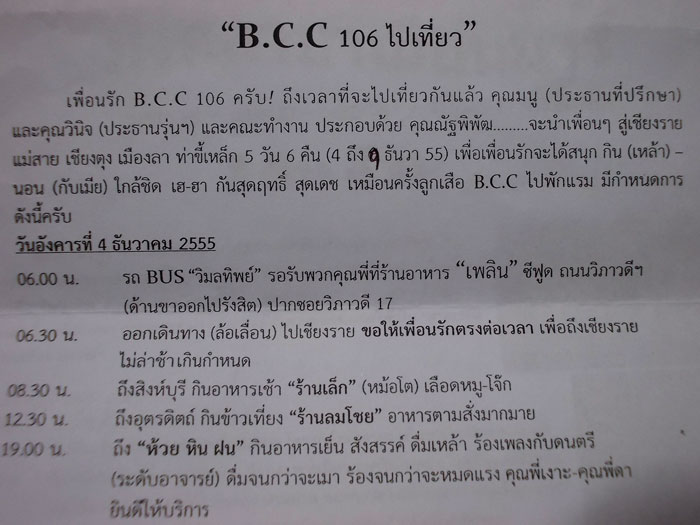 เพื่อนร่วมรุ่นนักเรียนสมัยประถม-มัธยมต้น/ปลาย ของผมจากโรงเรียนกรุงเทพคริสเตียนวิทยาลัย (BCC) ส่งหนังสือเวียนเชิญชวน (แกมบังคับกลายๆ) ให้ไปเที่ยว เชียงราย (พักที่รีสอร์ท"ห้วย หิน ฝน" ของเพื่อน อ.แม่จัน - ท่าขี้เหล็ก - เชียงตุง - เมืองลา (เมืองลา แค่ฝั่งพม่า ไม่ข้ามพรมแดนเข้าไปเมืองจีน) ในช่วงเวลาวันที่ 4 - 9 ธันวาคม ศกนี้ ... ปกติรุ่นผมจะจัดให้มี trip ยาวๆไปนานๆหลายวันเป็นประจำทุกปีครับ