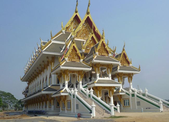 พระอุโบสถขนาดใหญ่สีขาวหลังคาสีน้ำเงินโดยมีทั้งสิ้น 3ชั้น