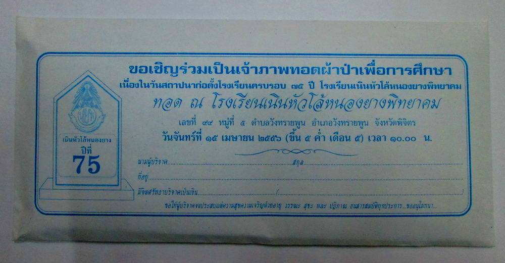ขอเชิญร่วมทำบุญทอดผ้าป่า ณ.โรงเรียนเนินหัวโล้หนองยาง อ.วังทรายพูน จ.พิจิตร วัตถุประสงค์ เพื่อหารายได้ปรับปรุงต่อเติมอาคารโรงอาหารของโรงเรียนเนินหัวโล้หนองยางพิทยาคม