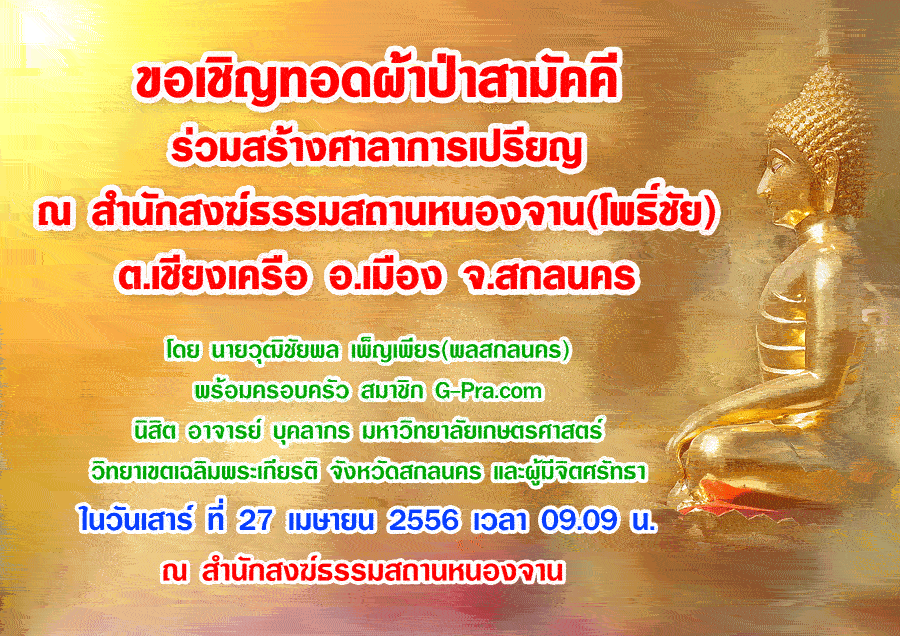 จากที่กระผมได้ลงแจ้งเพื่อนสมาชิก G-Pra และได้นำวัตถุมงคลร่วมประมูลเพื่อนำเงินรายได้ทอดผ้าป่าฯ ณ ธรรมสถานหนองจาน(วัดโพธิ์ชัย) เป็นระยะๆ ขณะนี้ได้เงินจำนวนสองหมื่นกว่าบาท และได้ทำการบอกบุญเพิ่มเติมนั้น ขณะนี้ได้ฤกษ์ทอดผ้าป่าแล้วจึงขอเชิญเพื่อนสมาชิกทุกท่านมาทำบุญร่วมกันนะครับ ท่านใดไม่สะดวกมาที่สกลนครสามารถแจ้งทำบุญได้นะครับ รายละเอียดยอดทำบุญอื่นผมจะแจ้งให้ทราบต่อไปนะครับ.....ขออนุโมทนาบุญล่วงหน้ากับทุกท่านด้วยครับ