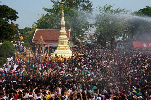 ร่วมกันประกอบพิธีอัญเชิญองค์หลวงพ่อพระใสออกจากพระอุโบสถ อัญเชิญองค์หลวงพ่อพระใส ประดิษฐานบนราชรถที่จัดเตรียมไว้ จัดเป็นรูปขบวนแห่รอบพระอุโบสถ 3 รอบ ในช่วงเวลาที่รอคอยมีผู้คนมากมายเตรียมอุปกรณ์ถังและขันใส่น้ำสะอาดเอาไว้ เพิ่มน้ำอบปรุงแต่งกลิ่นหอมด้วยดอกไม้นานๆพันธุ์ รวมจิตร่วมใจ ส่งมอบสายน้ำที่โปรยปรายเหมือนดังสายฝนให้ความสุขชุมชื่นทั่วบริเวณพื้นที่จัดงาน