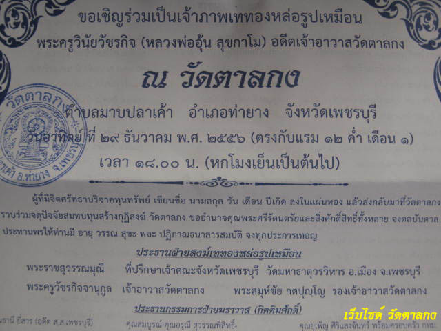 ผู้มีจิตศรัทธาติดต่อขอรับซองและแผ่นทองเหลือง แผ่นละ 100 บาท ได้ที่วัดตาลกง หรือหมู่เอกครับ....หรือร่วมทำบุญตามกำลังศรัทธาครัีบพี่น้อง งานบุญ งานใหญ่ มาถึงแล้ว..!!! วัดตาลกง ต.มาบปลาเค้า อ.ท่ายาง จ.เพชรบุรี 76130
