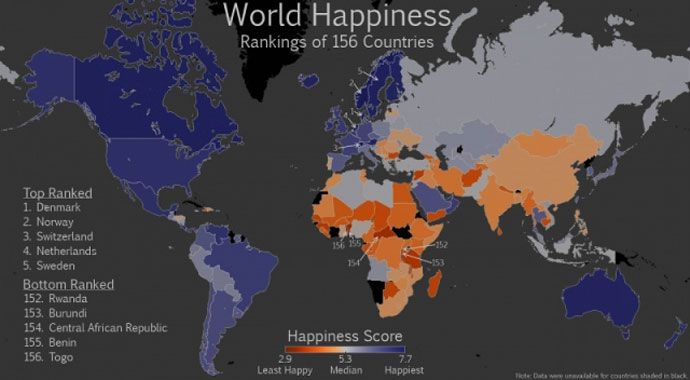 - วันนี้ คงไม่โดนแน่ เพราะพูดถึงประเทศที่มีความสุขในโลกใบนี้ 5 ประเทศต้นๆ และ 5 ประเทศท้ายๆครับ ... จัดทำโดนสหประชาชาติครับ ตามแผนที่ที่แนบครับ ... สีเข้ม คือประเทศที่อยู่แล้วมีความสุข สีอ่อนกว่าก็ลดลงไปตามลำดับ ... ประเทศไทยเราอยู่ที่สีฟ้า ครับ ... นับว่าไม่แย่เท่าใดครับ