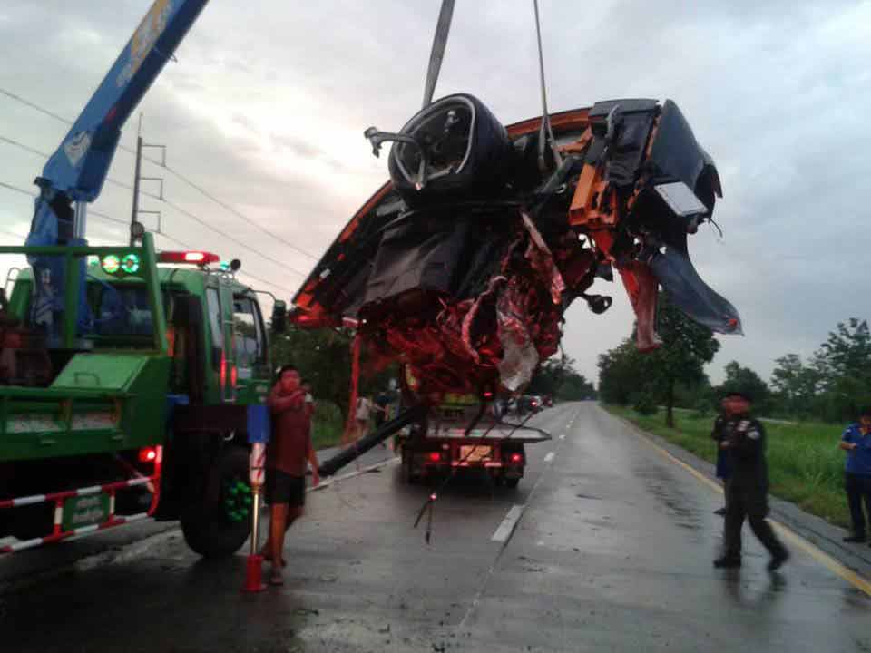 จากนั้นจึงเดินทางต่อมายัง จ.พิษณุโลก จนมาถึงที่เกิดเหตุในช่วงที่ฝนตกลงมาอย่างหนัก ถนนลื่น ประกอบกับขับรถมาด้วยความเร็วสูงกว่า 150 กม./ชม. จนเป็นเหตุให้รถเสียหลักพุ่งชนกับต้นไม้ข้างทางอย่างจัง ทำให้รถคันดังกล่าวขาดครึ่งเป็น 2 ท่อน แต่ตัวคนขับไม่ได้รับบาดเจ็บแต่อย่างใด ทั้งนี้ เจ้าหน้าที่ได้ประสานรถยกเพื่อเคลียร์พื้นที่เพื่อเปิดเส้นทางดังกล่าวแล้ว และจะหาสาเหตุที่แท้จริงต่อไป