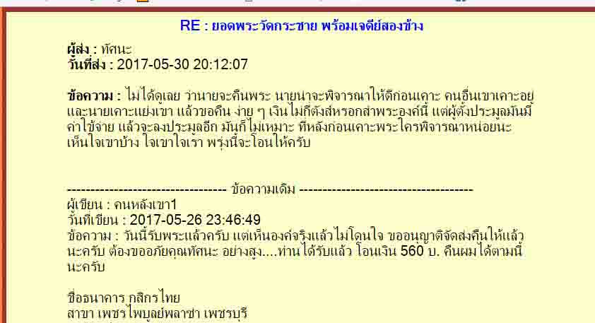 ผมชนะประมูลรายการ ของสมาชิก user ทัศนะ รายการนี้ https://www.g-pra.com/auction/view.php?aid=17451276 วันที่พฤหัสที่18 พ.ค. 2560 -22:05:20 น. ผมได้โอนเงิน ให้วันศุกร์ที่ 19 พ.ค. 2560 ซึ่งเพียงวันเดียวผมกลับได้รับคำติจากผู้ตั้งประมูล มันถูกต้องหรือไม่ครับ....ผมอธิบายให้ฟังครับ หลังจากผมโอนเงินไปแล้ว ผมได้รับพระวันที่ 26 พ.ค.2560 พอเปิดพระดู องค์จริงเนื้อหาไม่ถูกใจ ดูแล้วไม่น่าจะแท้ครับ (เพราะในภาพถ่ายไม่ค่อยชัด) ก็เลยตัดสินใจส่งคืนวันนั้น เดี๋ยวนั้นเลย ส่งคืนแล้วแจ้งเจ้าของให้ทราบทันที มาวันนี้ผมกลับได้รับคำติได้ไง งงครับ แล้วกฎกติการับประกันความพอใจละครับ มันใช้ไม่ได้เหรอ โอนเงินก็โอนภายใน1วัน รับแล้วไม่พอใจก็คืนเลยทันที ไม่ได้คำชม ยังกลับได้รับคำติ ผู้ตั้งประมูลบอกว่าเขามีค่าใช้จ่าย ต่อว่าผม แล้วผมอยากถามหน่อยครับว่าผมไม่มีค่าใช้จ่ายหรือไงครับ ผมก็มีค่าโอน ค่าส่งคืนเหมือนกัน มันไม่มีใครอยากเสียเงิน เสียเวลาหรอกครับ แต่พอรับพระองค์จริงแล้วมันไม่โดน ดูองค์จริงแล้วมันไม่มั่นใจว่าแท้ มันคืนไม่ได้เหรอครับ ผมประมูลพระได้ผมไม่เคยทำผิดกติกา โอนเงินคืนมาแล้วให้ฟิดแบคคำติผมแบบนี ผมเสียหาย กรณีนี้ใครรับผิดชอบครับ |