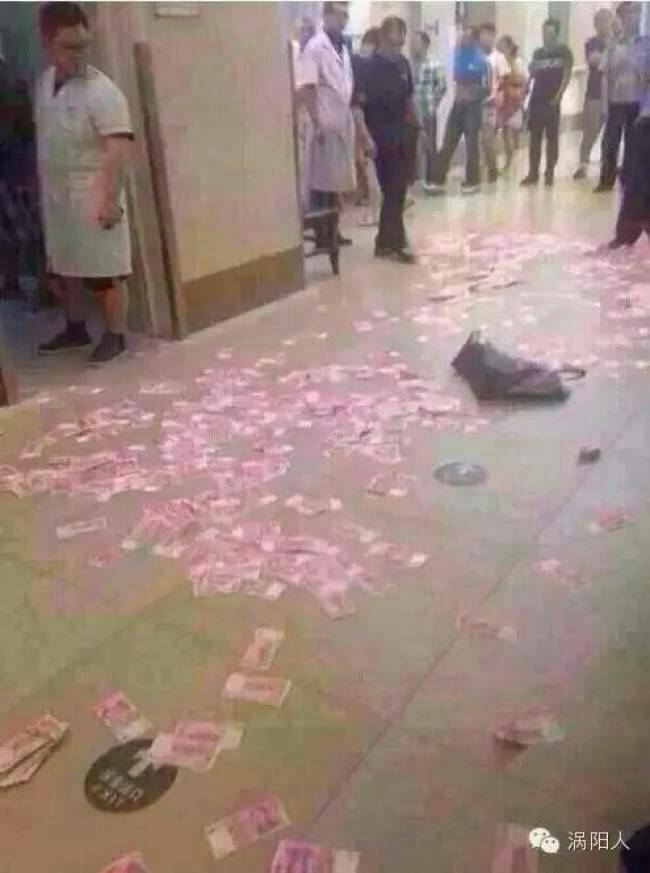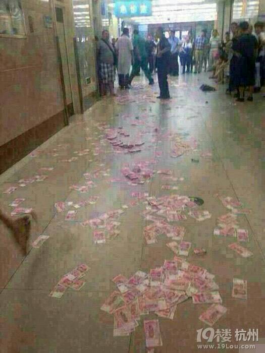 คนไข้ป่วยเป็นโรคมะเร็ง ที่มณฑลเฮยหลงเจียงประเทศจีน โปรยเงินเต็มทางเดินของโรงพยาบาล หมอบอกว่าไม่มีทางรักษาแล้ว คนไข้โมโห จึงนำเงินมาโปรยเล่น แล้วตะโกนว่า