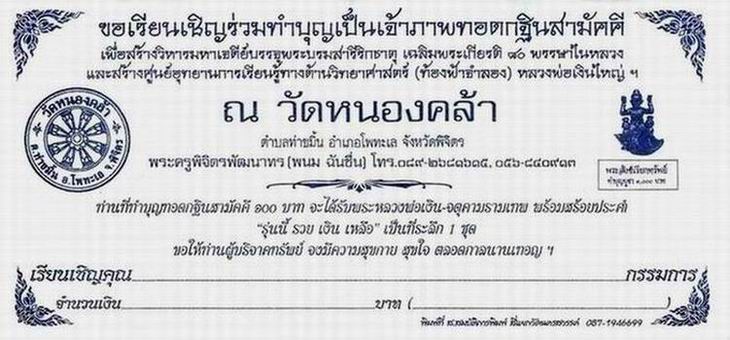 บอกบุญครับ สำหรับเพื่อสมาชิกทุกท่าน กระทู้นี้ผมนำบุญมาฝากครับ โดยขอเรียนเชิญร่วมทำบุญเป็นเจ้าภาพทอดกฐินสามัคคี ณ วัดหนองคล้า ต.ท่าขมิ้น อ.โพทะเล จ.พิจิตร เพื่อสร้างวิหารมหาเจดีย์ บรรจุพระบรมสารีริกธาตุ เฉลิมพระเกียรติ 80 พรรษาในหลวง และสร้างศูนย์อุทยานการเรียนรู้ทางด้านวิทยาศาสตร์ (ท้องฟ้าจำลอง) หลวงพ่อเงินใหญ่ครับ ซึ่งผู้มีจิตศรัทธา ที่ร่วมทำบุญ 100 บาท ขึ้นไป หลวงพ่อท่าน (พระครูพิจิตรพัฒนาทร เจ้าอาวาส) จะมอบ พระหลวงพ่อเงิน-จตุคามรามเทพ พร้อมสร้อยประคำ " รุ่นนี้ รวยเงินเหลือ " ให้ไว้เป็นที่ระลึกครับ ผมจึงขอนำมาบอกบุญกับเพื่อน ๆ ครับองค์จริงมีขนาด 3 ซ.ม. และขนาด 5 ซ.ม.ครับ เพื่อน ๆสามารถดูรายการพระได้จากกระทู้ พระเนื้อดิน ผง ว่าน หลังปี 2525 ครับ ผมขอเชิญเพื่อน ๆ มาทำบุญร่วมกันนะครับ เพราะกฐินนั้น ทำแค่ปีละครั้งครับ |