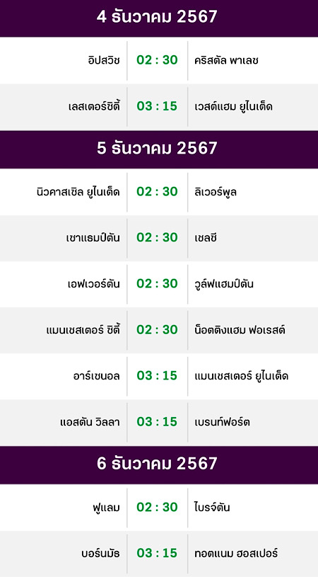 - คู่ที่ 1 เริ่มแข่งขันเวลา 02.30 น. วันที่ 4/12/67 ( คืนวันอังคาร )