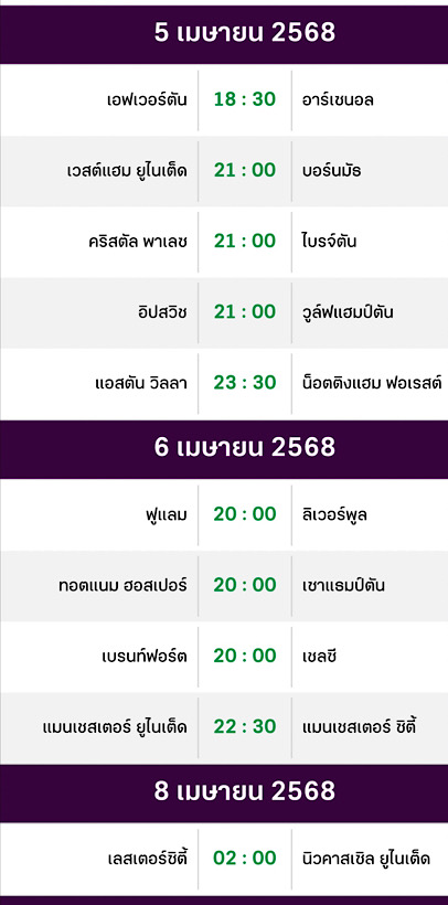 หัวข้อกระทู้ : ทายผล...เกมส์"แฟนพันธ์แท้การันตี-พรีเมียร์ลีก 2024-25" สัปดาห์ที่ 31(5-8/4/68)