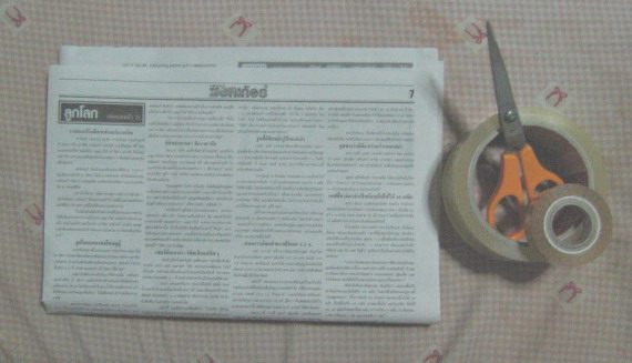 5.นำกล่องพสัดุที่เตรียมไว้ ลองพื้นกล่องด้วยหนังสือพิมพิ์
