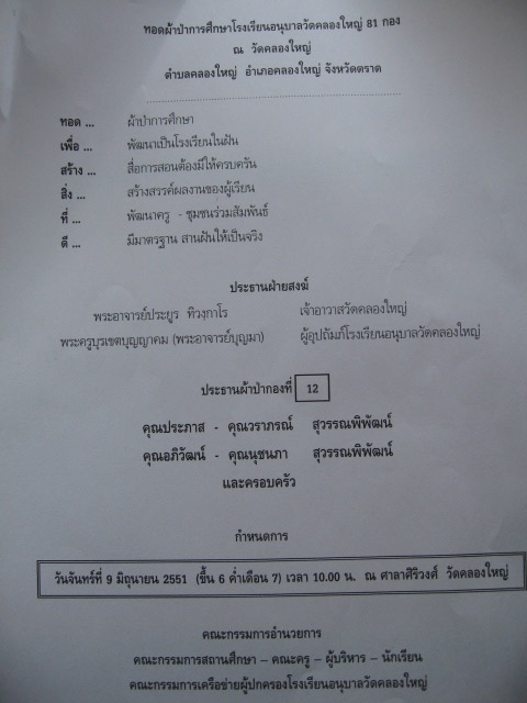 ด้วยโรงเรียนอนุบาลวัดคลองใหญ่ อำเภอคลองใหญ่ จังหวัดตราด (โรงเรียนในฝัน รุ่น 2) มีความประสงค์ที่จะหาเงินจำนวนหนึ่ง เพื่อปรับปรุงคุณภาพการเรียน การสอน พัฒนาเด็กให้มีคุณภาพตามมาตราฐาน จึงได้จัดทอดผ้าป่าขึ้น ณ ศาลาศิริวงศ์ วัดคลองใหญ่ อำเภอคลองใหญ่ จังหวัดตราด ในวันที่ 9 มิถุนายน 2551 เวลา 10.00 น. และขอเรียนเชิญท่านผู้มีจิตศรัทธาร่วมทำบุญกันครับ โดยผู้ที่ร่วมทำบุญ 100 บาท จะได้รับเหรียญอาจารย์วัน อุตตโม วัดถ้ำอภัยดำรงธรรม จังหวัดสกลนคร จำนวน 1 เหรียญ,ร่วมทำบุญ 200 บาท ได้รับเหรียญหลวงปู่ม่น วัดเนินตามาก จังหวัดชลบุรี รุ่นเจริญลาภ เนื้อทองแดง หรือ ทองเหลือง (แล้วแต่เลือก) จำนวน 1 เหรียญ และ ร่วมทำบุญ 300 บาท จะได้รับเหรียญหลวงพ่อโอด วัดจันเสน นครสวรรค์ รุ่น 6 รอบ จำนวน 1 เหรียญ ซี่งเหรียญทั้งหมดเป็นของที่ผมจัดหามาให้กับผู้ที่ร่วมทำบุญ โดยไม่หักค่าใช้จ่าย จึงขอเรียนเชิญทุกท่านมาร่วมกันเป็นเจ้าภาพในการทอดผ้าป่าด้วยกันนะครับ ผู้ที่ร่วมทำบุญกรุณาโอนเงินตามบัญชีที่แจ้งได้เลยครับ และลงที่อยู่สำหรับจัดส่งพระมาด้วยนะครับ และขอให้ผลบุญในครั้งนี้ ดลบันดาลให้ท่านและครอบครัว มีความสุข ความเจริญ มีสุขภาพพลานามัยที่แข็งแรง คิดหวังสิ่งใด ขอให้สมความปรารถนาตลอดไปครับ