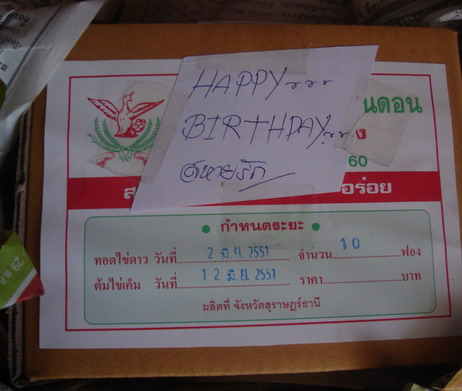 ผมตกใจเห็นรูปที่ถ่ายเขียนที่อยู่ผิดเป็นสุราษฎร์ธานี ไม่ไช่เพชรบุรี กราบขอบพระคุณไปรษนีย์ไทย ที่แก้ไข จนสหายผมได้ไข่ไปฉลองวันเกิด ครบ10ฟอง สุขสันต์วันเกิดอีกครั้งครับสหาย อ้วน อ้วน