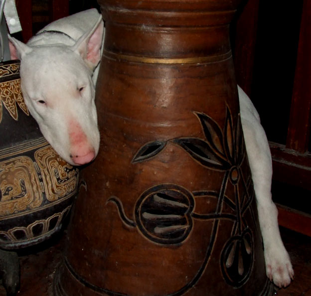 เรื่องมีอยู่ว่า เมื่อวาน เจ้าอังเปาตัวแสบ แอบ ฉิงฉ่อง ในบ้าน กฏมีอยู่ว่า ถ้าละเมิด อธิปไตย แอบเข้ามาประกาศดินแดน นอกเหนืออนาเขต ของ คนแล้ว จะได้รับการตอบโต้ ด้วย อาวุธหนัก(ไม้เรียว ไม้แขวนเสื้อ) ซึ่งก่อนหน้านี้เคยโดนมาแล้ว น่าจะจำได้ จึงเกิดภาพนี้ขึ้นมา เนื่องจาก ผมออกมาเห็น ไอ้ตัวแสบกำลังยิง ขีปนาวุธสุดท้าย พอดี เจ้าอั่งเปามันเห็นผม เท่านั้นแหละ รีบวิ่งตะเกียกตะกาย เข้าไปในช่อง หลัง กระถางน้ำพุ ด้วยพุงอ้วนตัน เลยติดคาอย่างนั้น ขยับออกไม่ได้ สามารถจับกุมและ ถ่ายรูปไว้เป็นหลักฐาน เพื่อดำเนินคดีต่อไป