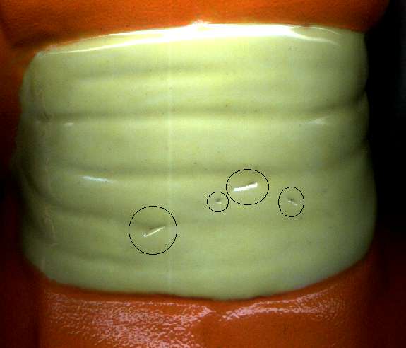 ส่วนด้านหลังตรงผ้ารัดเอวก็จะเห็นรอยตำหนิเป็นร่อง อีก 4 ตำแหน่ง มองด้วยตาเปล่าเห็นได้อย่างชัดเจน