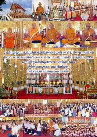 คมชัดลึก :เมื่อวันจันทร์ที่ ๒๒ มิถุนายน ๒๕๕๒ เป็นวันครบรอบคล้ายวันมรณภาพ ๑๓๗ ปี สมเด็จพระพุฒาจารย์ (โต พรหมรังสี) วัดโล่ห์สุทธาวาส ได้จัดงานทำบุญถวายเป็นการกุศลแด่เจ้าประคุณสมเด็จฯโต ซึ่งได้จัดเป็นประจำทุกปีที่ผ่านมา โดยในปีนี้ ได้มีการแจกทาน, มอบทุนการศึกษา แก่นักเรียนที่ขาดทุนทรัพย์-ยากไร้, พิธีพุทธาภิเษกวัตถุมงคล เพื่อบรรจุกรุ สืบทอดพระพุทธศาสนา ตามคติโบราณ และจัดพิธีครอบมงคลดวง ด้วยพระคาถาชินบัญชร ๑๐๘ คาบ แก่ผู้ที่ร่วมงาน เพื่อความเป็นสิริมงคล เสริมดวง า ฯลฯ โดยมีพระคณาจารย์ร่วมนั่งปรกอธิษฐานจิต และครอบมงคลดวง อาทิ พระราชวชิราภรณ์ วัดพระเชตุพนฯ, หลวงปู่เจือ วัดกลางบางแก้ว, หลวงพ่อเฉลิม วัดพระญาติ, หลวงพ่อเอียด วัดไผ่ล้อม, หลวงพ่อเพี้ยน วัดเกริ่นกฐิน หลวงพ่อโทน วัดเชิงหวาย ฯลฯ