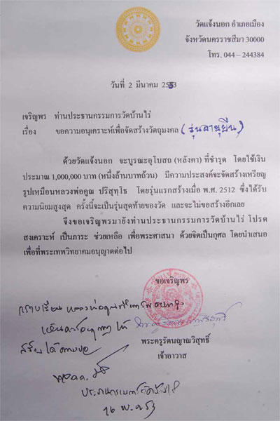 @@@@@ มีข่าวฝากมาบอกครับ ขอเชิญร่วมทำบุญบูรณะอุโบสถวัดแจ้งนอก โ ดยมีหลวงพ่อคูณ ปริสุทโธท่านได้เมตตาอนุญาตจัดสร้างวัตถุมงคลรุ่น ( อายุยืน ) โดยทางวัดแจ้งนอกได้รับอนุญาตจัดสร้างเหรียญ ครึ่งองค์เต็มองค์อายุยืน ปั้มรูปเหมือนอายุยืน รูปหล่อเบ้าทุบอายืน เหรียญแจกทานครึ่งองค์เล็กอายุยืน นาคปรกพิมายอายุยืน มีเนื้อทองคำ+เงิน+นวะ+ทองฝาบาตร+เนื้อทองแดงรมดำ+เนื้อทองแดงมันปู+เนื้อทองแดงขัดเงา @@@@@ |