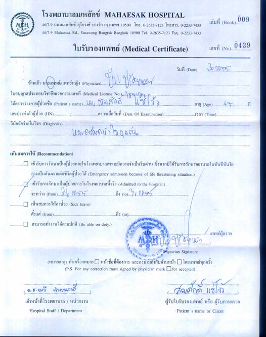 เนื่องด้วยผมเป็นโรคหลอดเลือดหัวใจอุตตันฉับพันธ์ ในคืนวันที่25-7-55 และได้เข้าห้อง ไอซียู เป็นเวลา3วันและพักฟื้นที่โรงพยบาล2วัน หมอเพิ่งให้กลับมาพักที่บ้านในเย็นวันนี้ ผมได้แนบเอกศารมาให้ดูว่าเป็นความจริง ส่วนพระที่ค้างส่งผมจะรีบจัดส่งไปให้นะครับ รับลองว่าจัดส่งให้แน่นอน ด้วยความเคารพ จึงเรียนขออภัยมาในครั้งนี้ด้วยครับ |