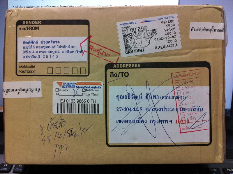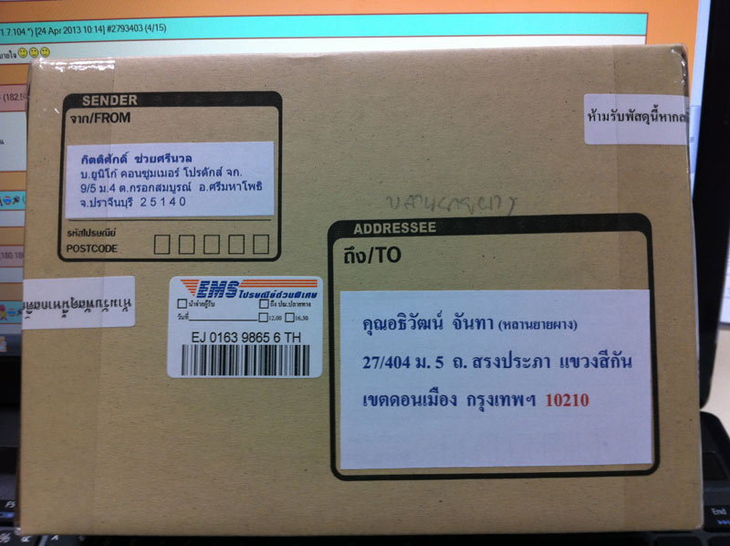 เป็ยรายการจองพระกริ่งพุทธวัง ลป.เจิม ครับ ผมส่งของไปให้ตั้งแต่วันที่ 24 เมษายน 2556 ตามที่อยู่ที่ให้ไว้ เมื่อวานพัสดุตีกลับคืนมาที่ผมโดยรุบะว่า บ้านปิด ไม่สามารถนำจ่ายได้และทาง ปณ.นำส่งคืนผู้ฝากตามขั้นตอน