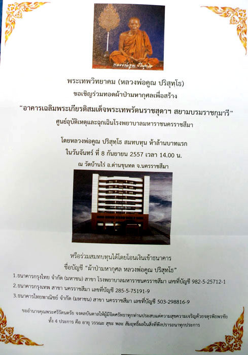 ผมเอาซองมาจากโรงพยาบาลมหาราชครับ ตามนี้เลย ใครที่รักหลวงพ่อมากกกก งานนี้ไม่มีแจกเหรียญ ไม่มีนำฤกษ์ ไม่มีเข้าแถวรับบัตรคิว ไม่มีหน้าม้า ไม่มีผู้สร้าง มีแต่ไปเสียเงิน เพื่อสร้างบุญล้วนๆครับ เชิญนะครับ ไปเข้าแถวยื้อแย่งซองผ้าป่ากันได้เหมือนตอนไปรับพระฟรี ไม่มีแม่ชีมาตะโกนด่า ท่านจะวนกี่รอบก้ได้ ได้ซองแล้วเอามาแห่นอกวัดให้คนทำบุญก็ได้ เชิญศิษย์หลวงพ่อทุกท่านครับ ตึกที่โรงพยาบาลกำลังสร้างพร้อมๆกัน 3 ตึกต้องใช้เงินอีกมากครับ |