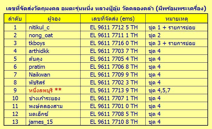 | หัวข้อกระทู้ : => แจ้งหมายเลขจัดส่ง วัตถุมงคล อมตะรุ่นหนึ่ง หลวงปู่อุ้ย วัดคลองคล้า (มีพร้อมพระเครื่อง) |