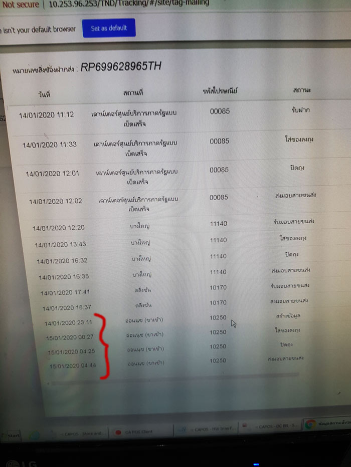 พัสดุถึงไปรษณีย์ปลายทาง (ไปรษณีย์อ่อนนุช) เมื่อ 14/01/2563 เวลา 23:11 น. (ตามรูปที่แนบมาด้วย 1.)